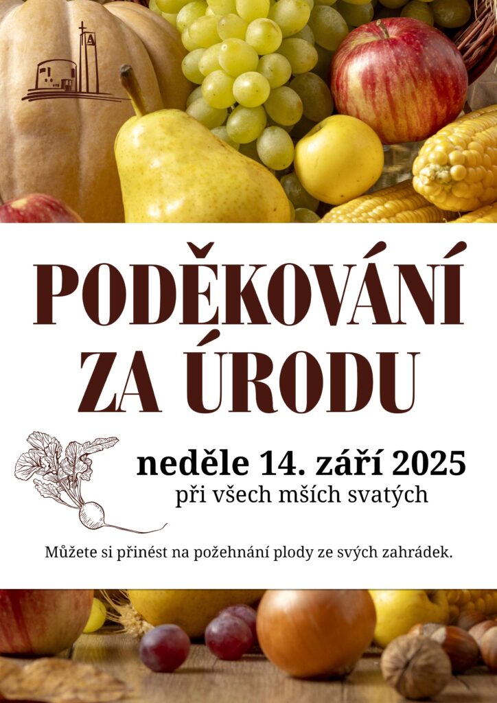Poděkování za úrodu 11 září, 2025 admin Přijďte poděkovat za úrodu v neděli 14. záři 2025 při všech mších svatých. Můžete si přinést na požehnání plody ze svých zahrádek.